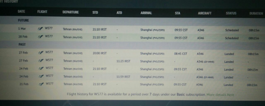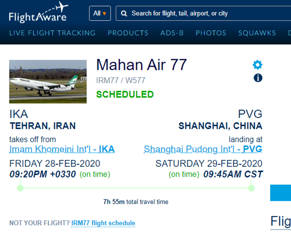بعض الرحلات الجوية التي قامت بها شركة ماهان إير إلى الصين في الأيام الأخيرة هي كما يلي: