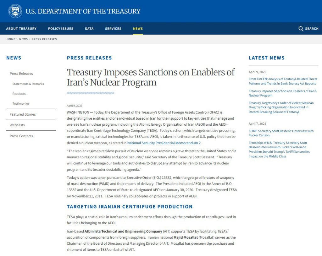 أعلنت وزارة الخزانة الأميركية، يوم 9 نيسان 2025، عن فرض عقوبات جديدة استهدفت خمس كيانات وشخصًا واحدًا في إيران، بسبب دعمهم لكيانات رئيسية تشرف على برنامج إيران النووي، وعلى رأسها منظمة الطاقة الذرية الإيرانية (AEOI) وشركة تكنولوجيا أجهزة الطرد المركزي الإيرانية (TESA) التابعة لها.