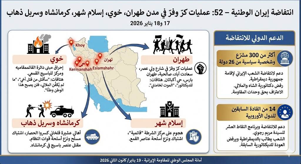 أفاد بيان المجلس الوطني للمقاومة الإيرانية (رقم 52 حول الانتفاضة الوطنية)، بأن يومي السبت والأحد (17 و18 يناير 2026) شهدا مواجهات واسعة النطاق. ففي العاصمة طهران، تحولت مناطق حيوية مثل شارع “ولي عصر”، و”سعادت آباد”، و”صالحية”، و”طهران بارس”، وحي “أكباتان” إلى ساحات للكر والفر، حيث ردد المحتجون شعارات “الموت للديكتاتور” و”الموت لخامنئي”.