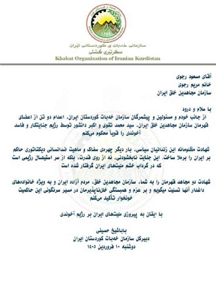 رسالة الأمين العام لمنظمة خبات كردستان إيران بشأن إعدام المجاهدين محمد تقوي وأكبر دانشوركار السيد مسعود رجوي السيدة مريم رجوي منظمة مجاهدي خلق الإيرانية تحية طيبة وبعد،