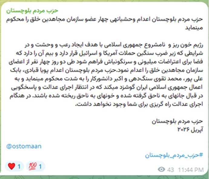 من جانبه، أدان «حزب شعب بلوشستان» الإعدام الوحشي لأربعة من أعضاء منظمة مجاهدي خلق، محذرًا من أنّ النظام سيُحاسب على هذه الجرائم، وأنه لا مفرّ من العدالة والمساءلة عن الأرواح التي أُزهقت ظلمًا والدماء التي سُفكت بغير حق.