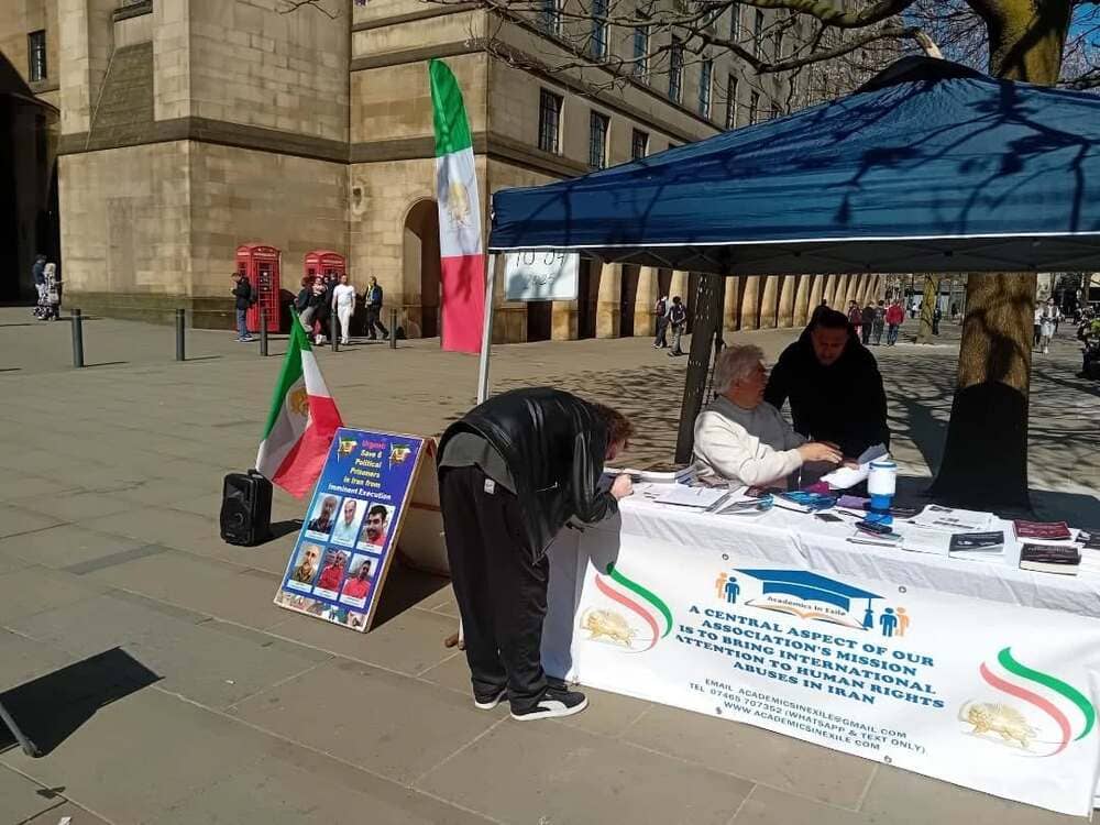 The Academics in Exile Association stated on X platform: “Bookstall by the Academics Association in Manchester 10, April. In solidarity with political prisoners and in protest against the ongoing use of torture and systematic executions in Iran, which have seen a troubling rise this week.”