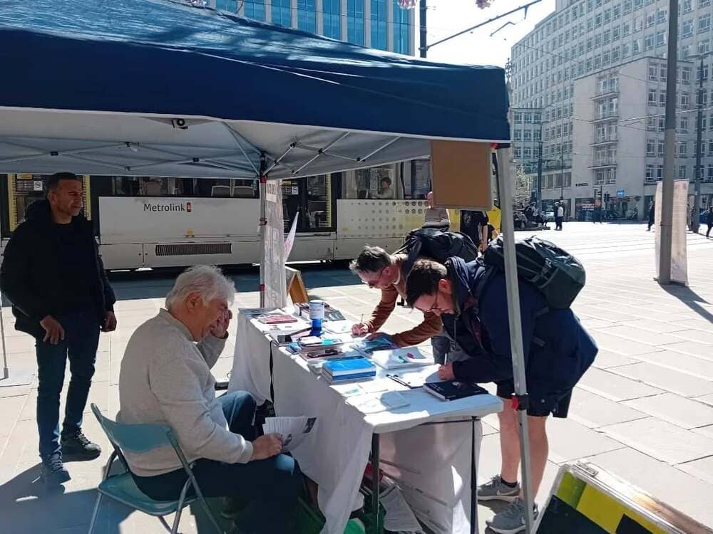 Manchester, UK – April 10, 2025: Members of the Academics in Exile Association, who support the People’s Mojahedin Organization of Iran (PMOI/MEK), organized a bookstall and photo exhibition in Manchester to protest the death sentences imposed on political prisoners affiliated with the PMOI. The event was held in solidarity with political prisoners and in response to the alarming rise in torture and systematic executions in Iran, which have intensified over the past week.