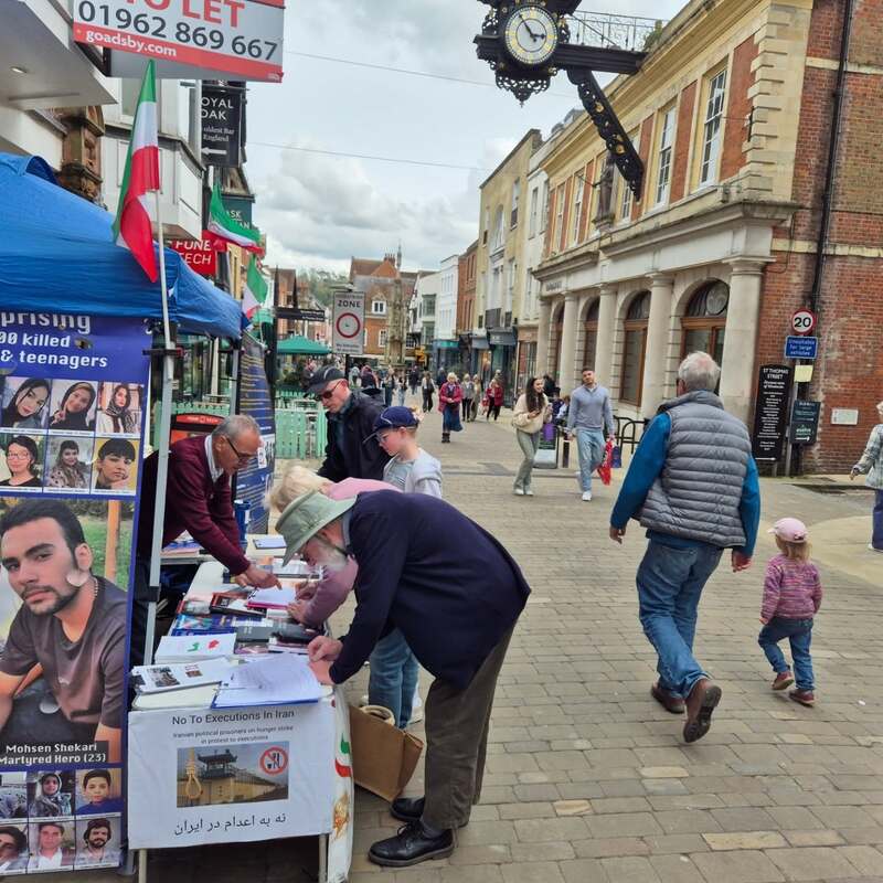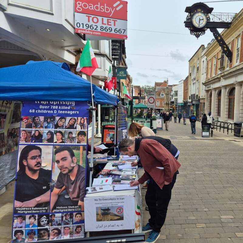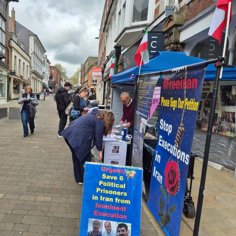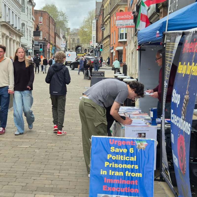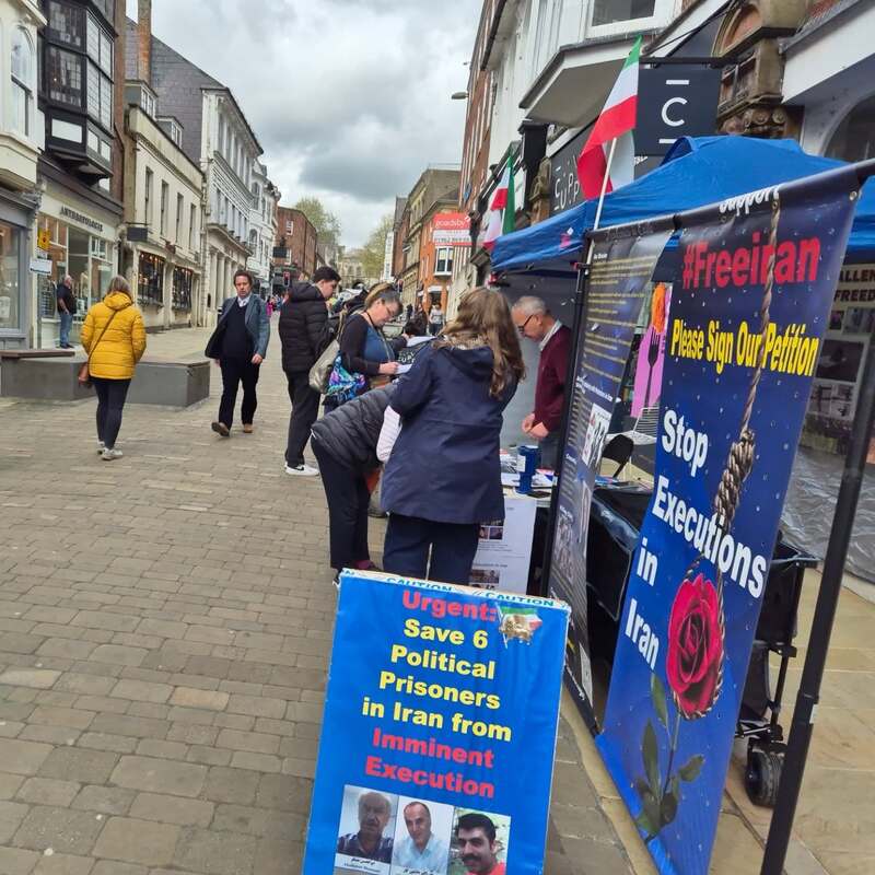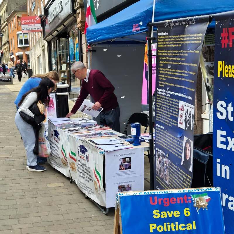Winchester, UK – April 14, 2025: The Academics in Exile Association, supporters of the People’s Mojahedin Organization of Iran (PMOI/MEK), organized a public bookstall and photo exhibition in Winchester to protest the recent wave of executions in Iran, including the execution of five political prisoners in Vakilabad Prison in Mashhad.