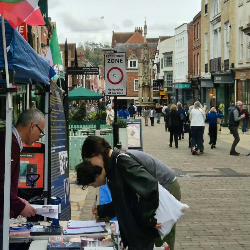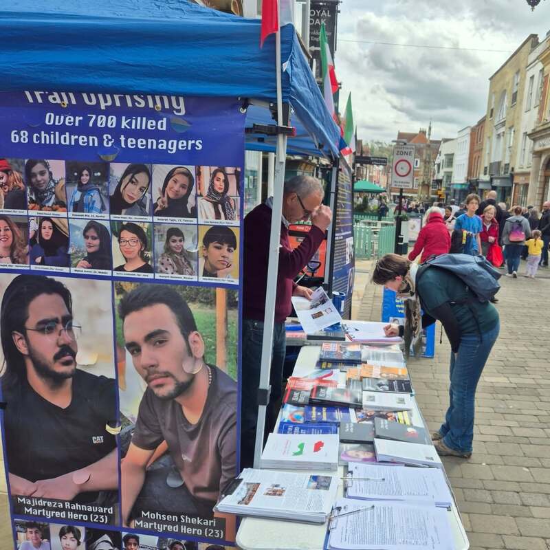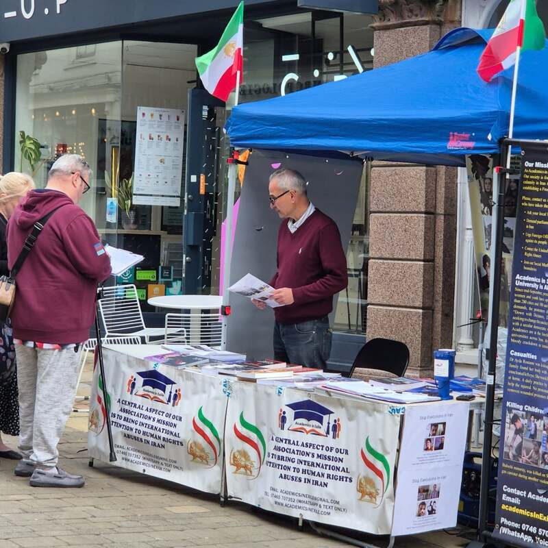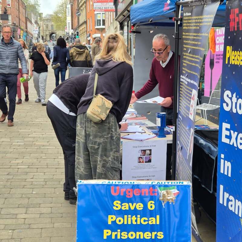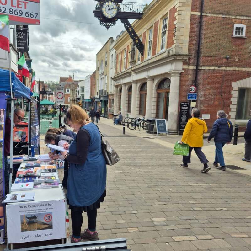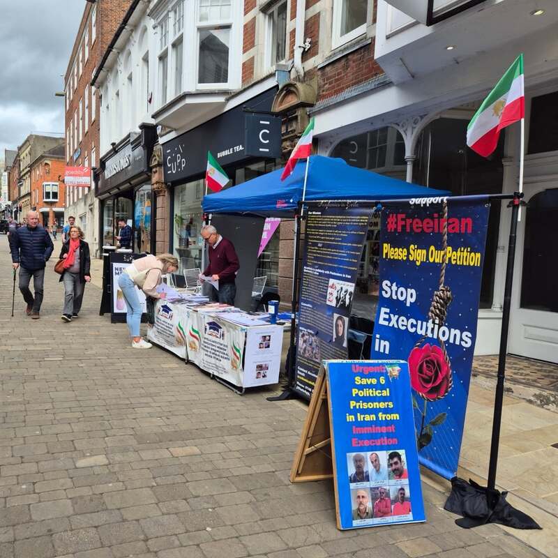 Winchester, UK – April 14, 2025: The Academics in Exile Association, supporters of the People’s Mojahedin Organization of Iran (PMOI/MEK), organized a public bookstall and photo exhibition in Winchester to protest the recent wave of executions in Iran, including the execution of five political prisoners in Vakilabad Prison in Mashhad.