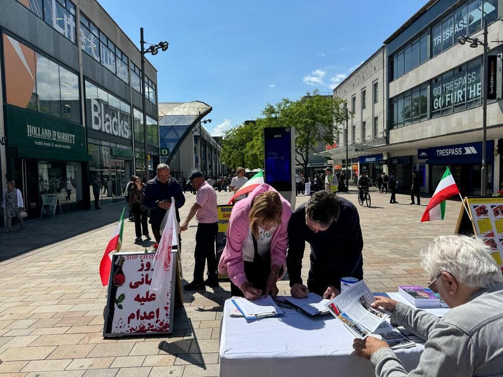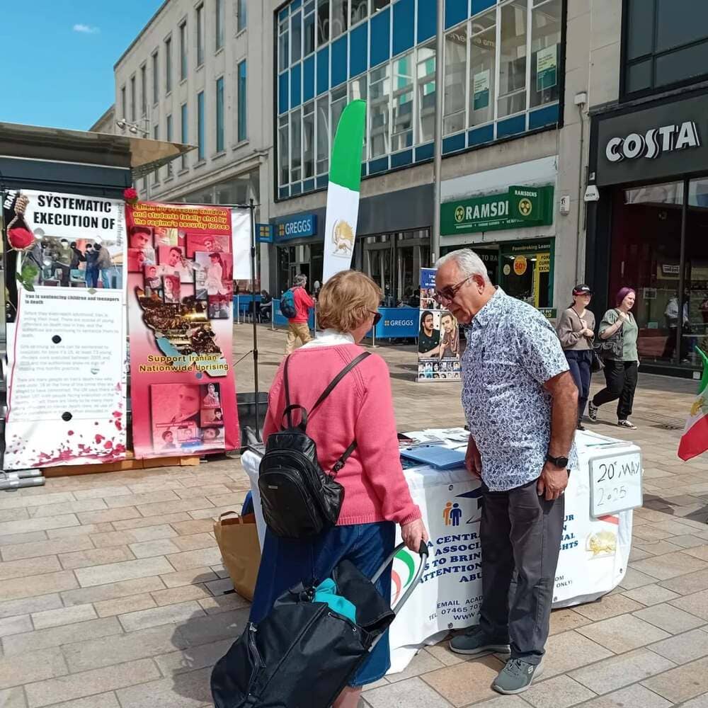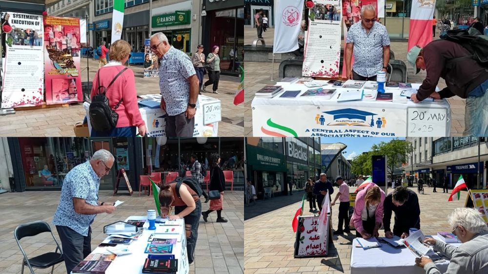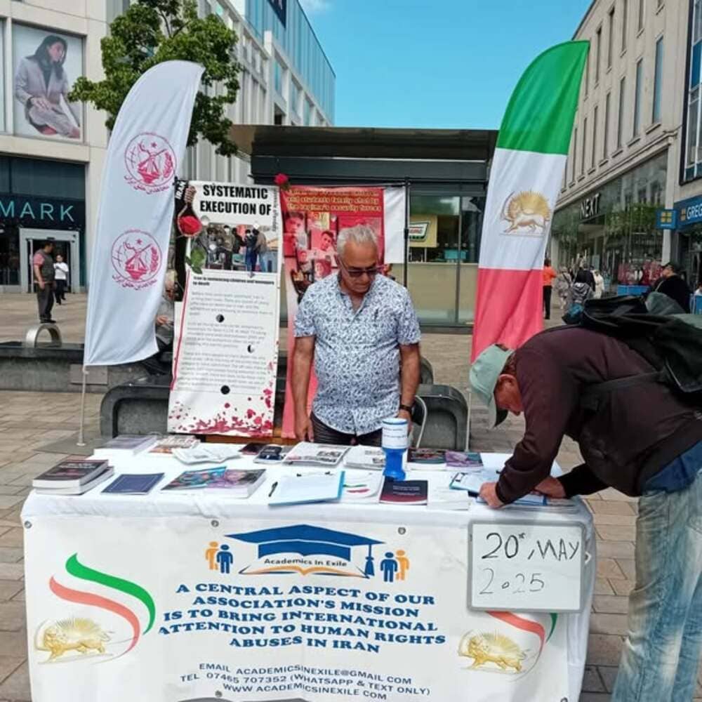 Sheffield, UK – May 20, 2025: The Academics in Exile Association, affiliated with the People’s Mojahedin Organization of Iran (PMOI/MEK), held a public bookstall and photo exhibition in Sheffield to denounce the latest wave of executions in Iran.