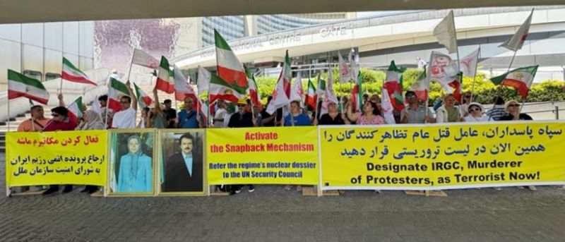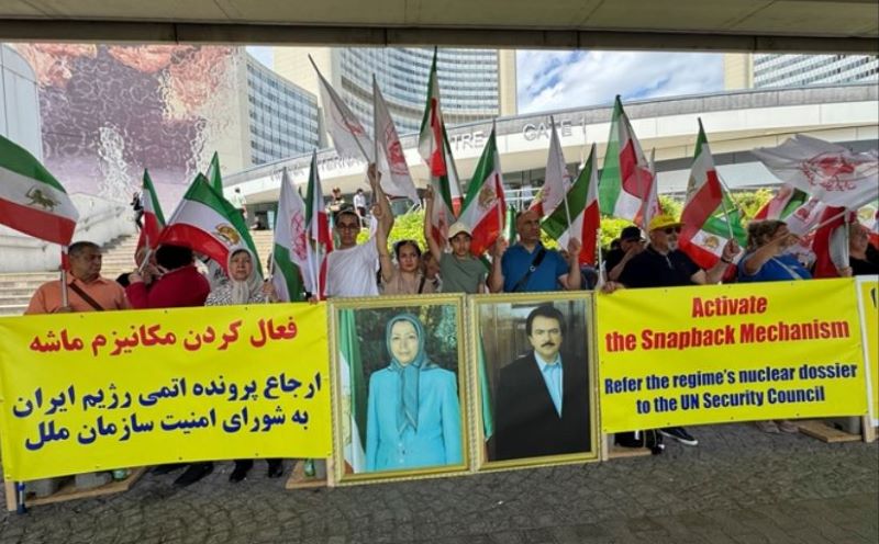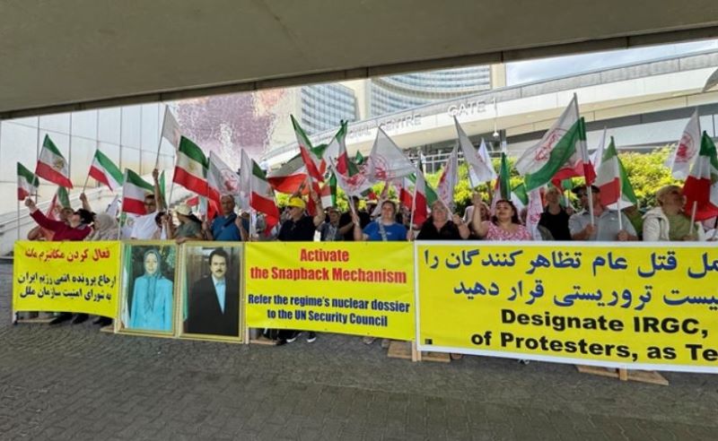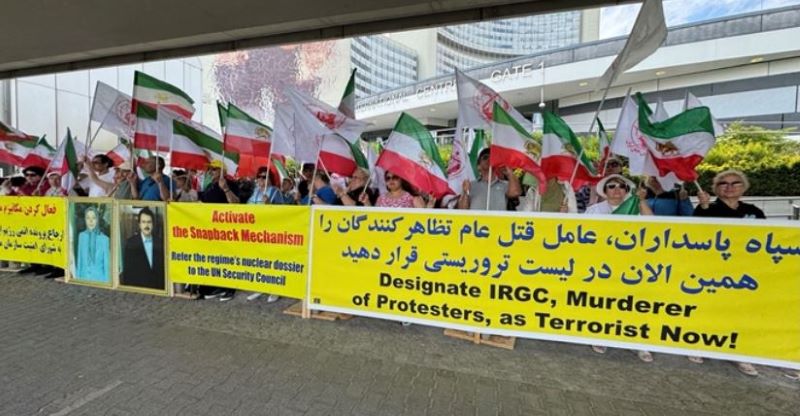 Outside the IAEA headquarters, protesters from the Iranian Resistance demanded the activation of snapback sanctions and the re-implementation of all United Nations Security Council resolutions to prevent the regime from acquiring nuclear weapons. Demonstrators emphasized that restrictions on Iran’s production of advanced centrifuges and uranium enrichment to near-weapons-grade levels are set to expire in October 2025, removing key obstacles to Tehran’s pursuit of nuclear arms.