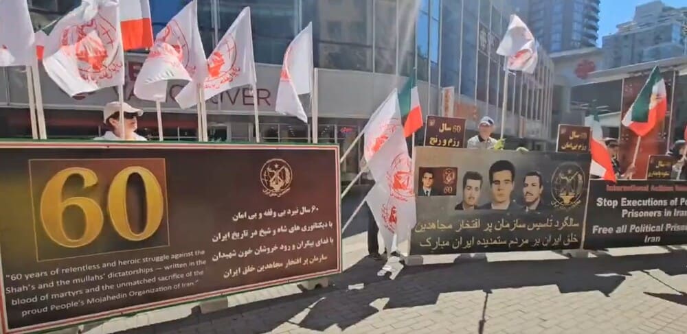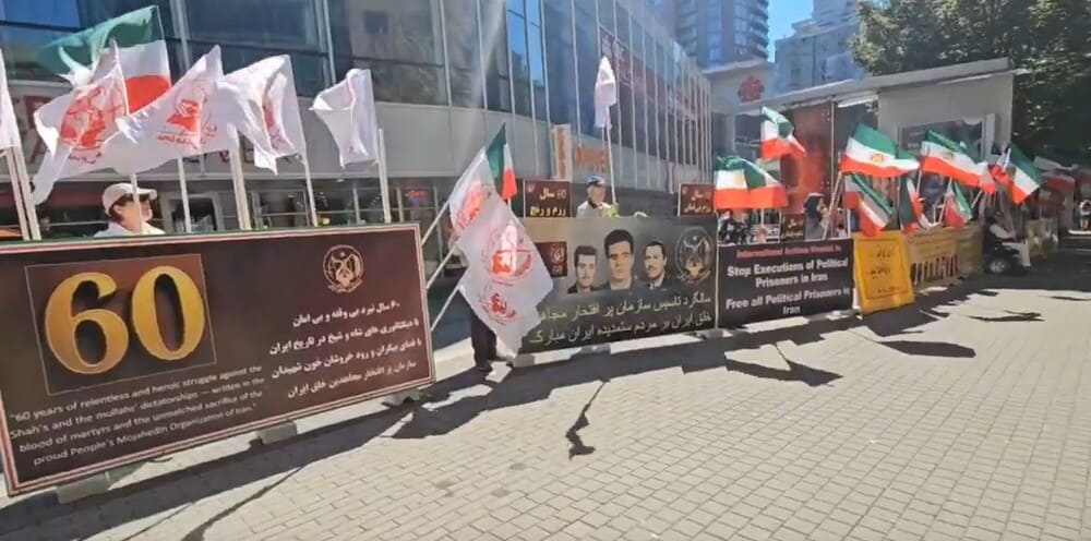 Vancouver, Canada – August 23, 2025: Supporters of the People’s Mojahedin Organization of Iran (PMOI/MEK) held a rally marking the 60th anniversary of the organization, honoring its founders and martyrs. They condemned the regime’s attempts to erase history by converting the mass graves of the 1980s into a parking lot.