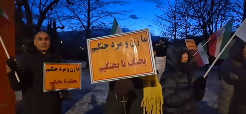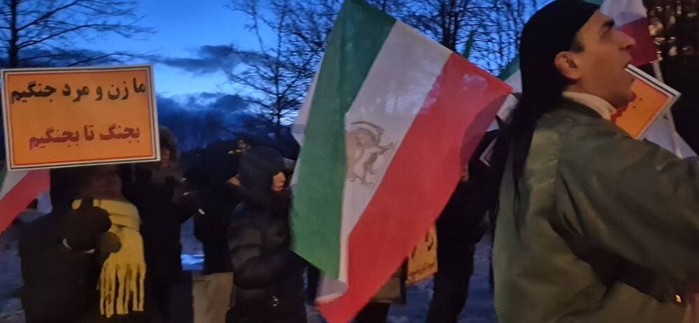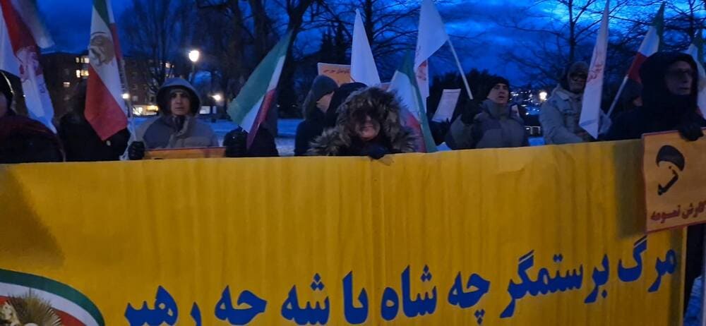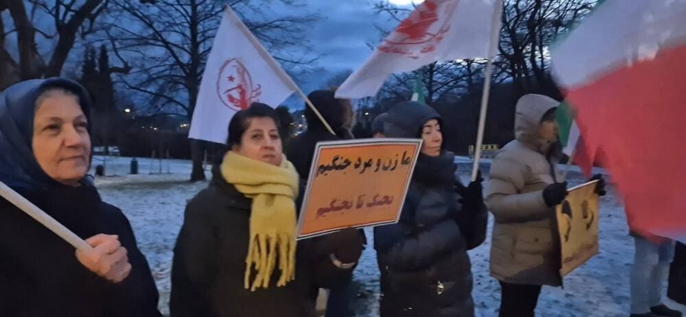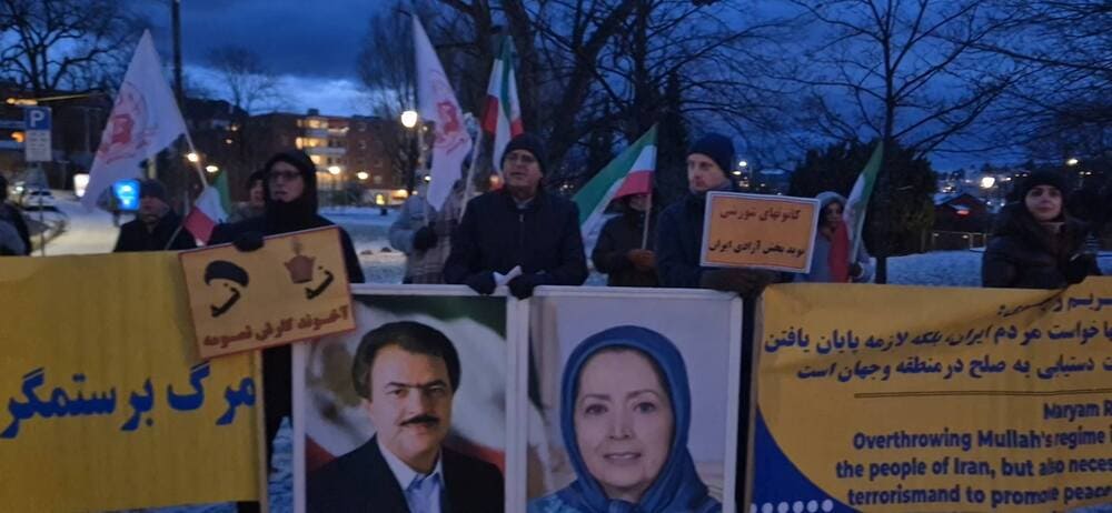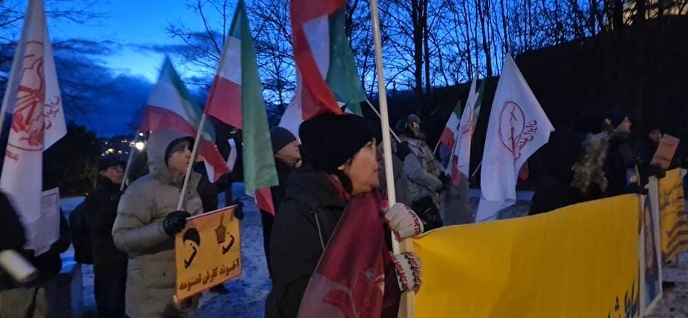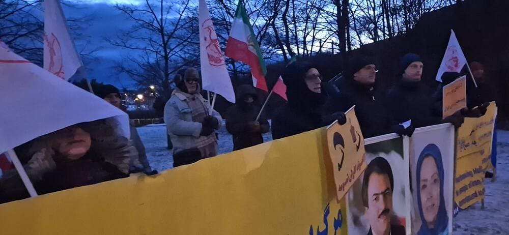 Iranian PMOI supporters rally in snowy Oslo outside regime’s embassy, supporting Iran’s uprising for regime change.