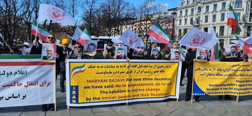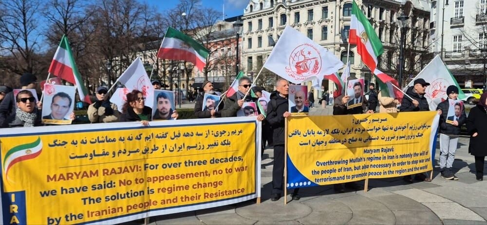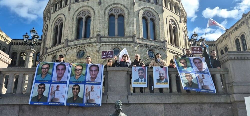 Oslo – April 4, 2026: Supporters of the Iranian Resistance gathered outside the Norwegian parliament to protest the executions of six political prisoners affiliated with the People’s Mojahedin Organization of Iran (PMOI/MEK): Mohammad Taghavi, Akbar Daneshvar Kar, Babak Alipour, Pouya GhobadiVahid Bani-Amerian, and Abolhassan Montazer.