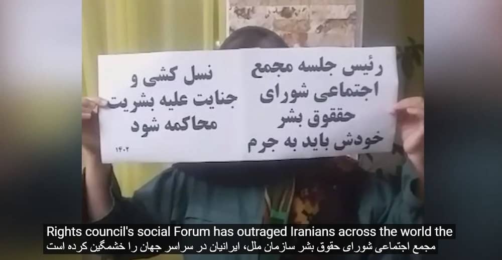 “Shame on those who forced Khamenei’s representative as the chair of the UNHRC Social forum and shame on those who accepted it,” another placard read.