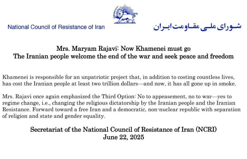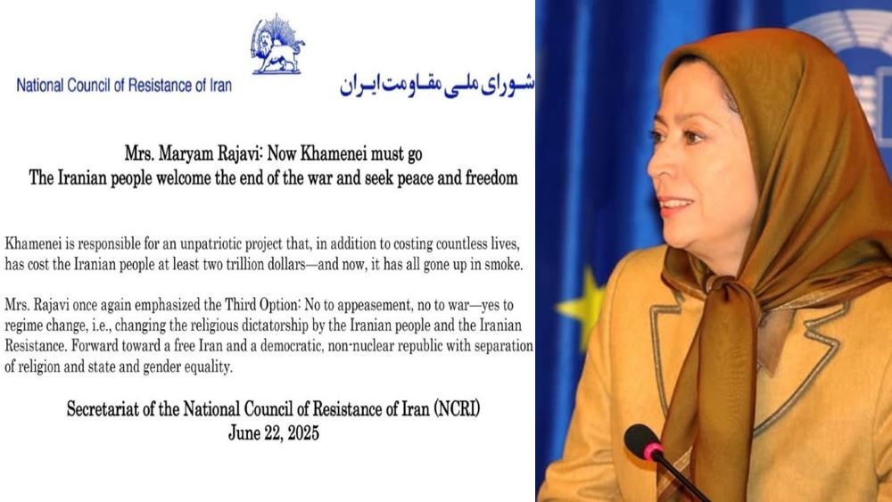 Mrs. Maryam Rajavi declared that now Khamenei must go. She emphasized that the Iranian people welcome the end of the war and seek peace and freedom.