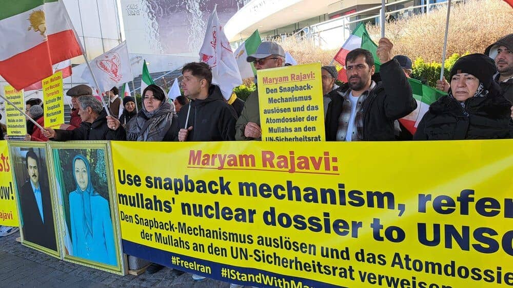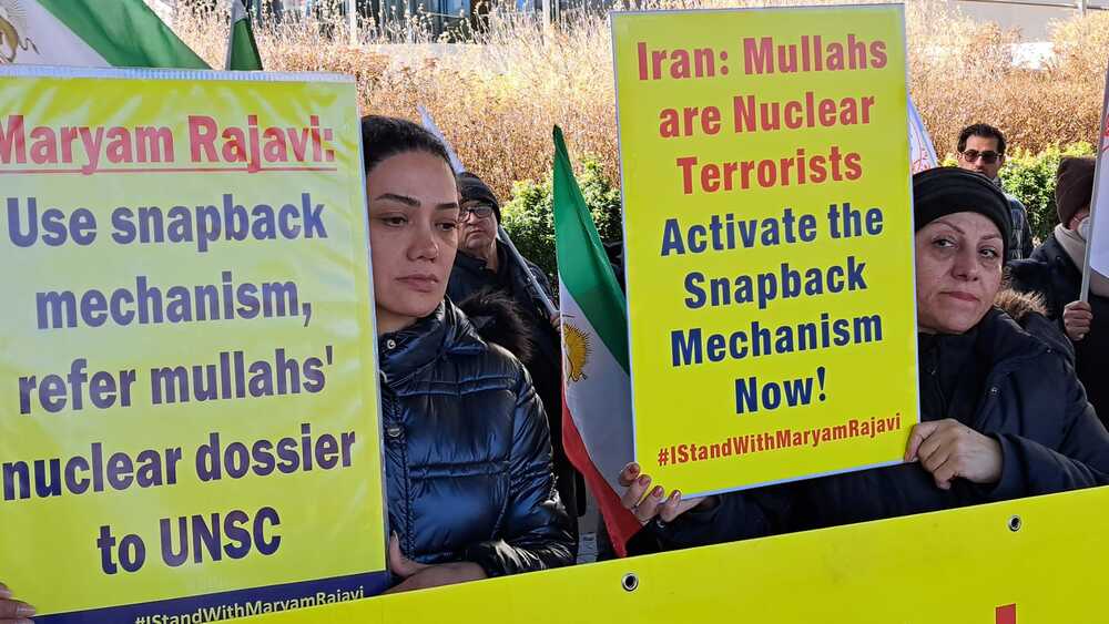 The protesters also denounced the regime’s longstanding use of negotiations as a deceptive tool to advance its nuclear ambitions and destabilizing policies in the region. They held banners and pictures of Maryam Rajavi, the President-elect of the NCRI, emphasizing the necessity of a firm Western policy against the clerical regime. In a U.S. Congressional Hearing on February 26, 2025, Mrs. Rajavi called for activating the snapback mechanism, shutting down the regime’s nuclear program, and placing the regime under Chapter VII of the UN Charter due to its threats to global peace and security.